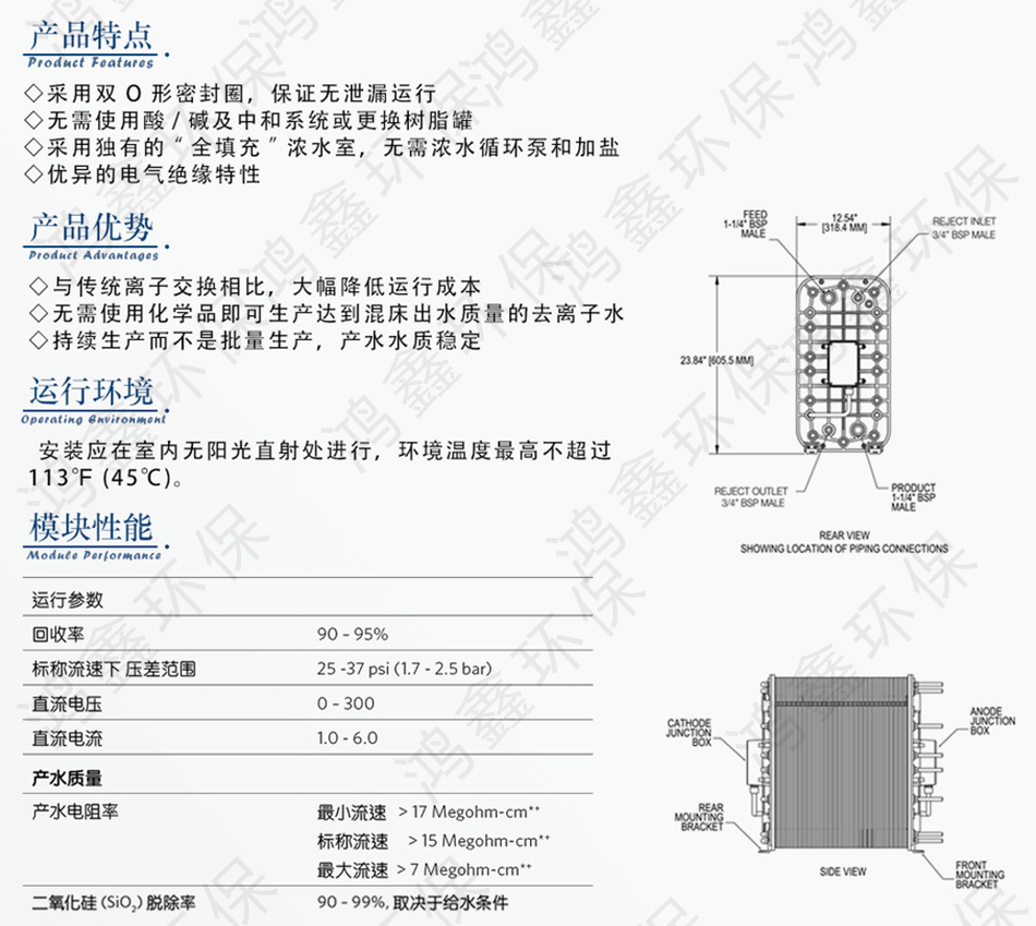 edi模块它巧妙的将电渗析和离子交换技术相结合,利用两端电极高压使水中带电离子移动,并配合离子交换树脂及选择性树脂膜以加速离子移动去除。离子交换膜技术和离子电迁移技术相结合的纯水制造技术。它巧妙的将电渗析和离子交换技术相结合,利用两端电极高压使水中带电离子移动,并配合离子交换树脂及选择性树脂膜以加速离子移动去除。在edi除盐过程中,离子在电场作用下通过离子交换膜被清除。同时,水分子在电场作用下产生氢离子和氢氧根离子,这些离子对离子交换树脂进行连续再生,以使离子交换树脂保持最佳状态