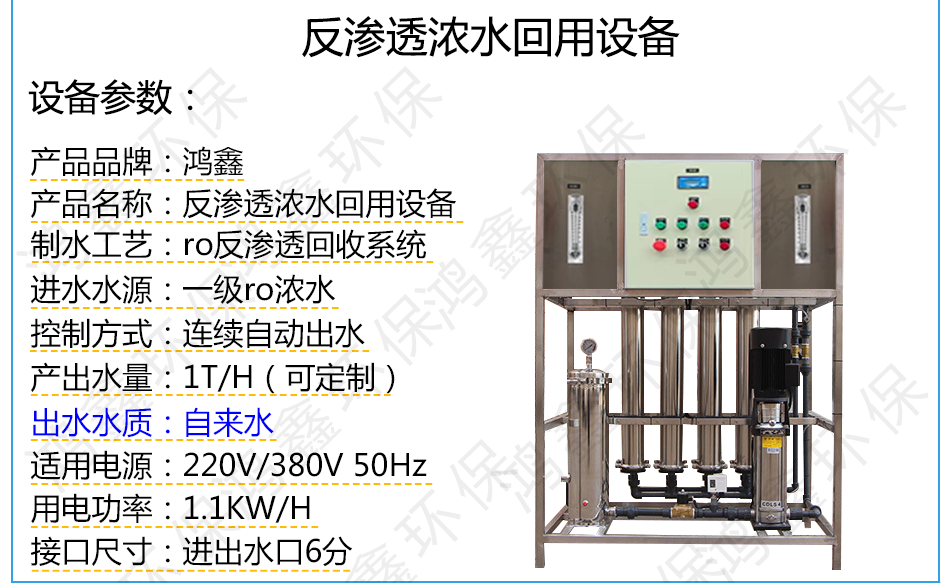 RO浓水回收设备是专门处理ro反渗透纯水设备的一级浓水,将一级RO浓水处理后变成自来水混入原水中再给反渗透设备当自来水用,回收率在60%~70%之间。像这个1T/H的浓水回用设备每小时可处理浓水1.5吨,也就是1吨浓水处理后有0.6T~0.7T变成自来水回到纯水设备的自来水箱中当自来水再用。