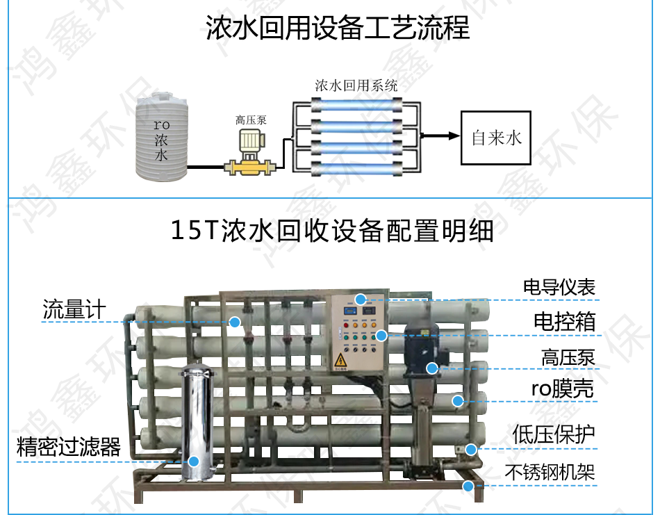 反渗透浓缩水处理是专门处理ro反渗透纯水设备的一级浓水,将一级RO浓水处理后变成自来水混入原水中再给反渗透设备当自来水用,回收率在60%~70%之间。像这个15T/H的浓水回用设备每小时可处理浓水22吨,也就是1吨浓水处理后有0.6T~0.7T变成自来水回到纯水设备的自来水箱中当自来水再用。