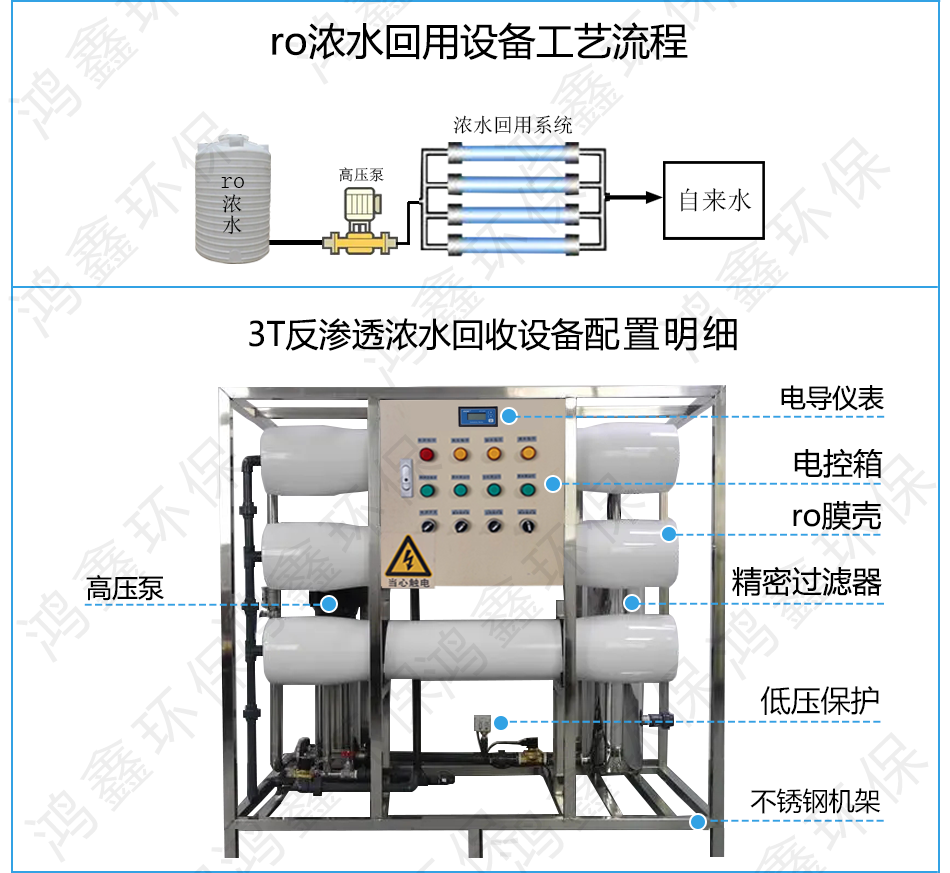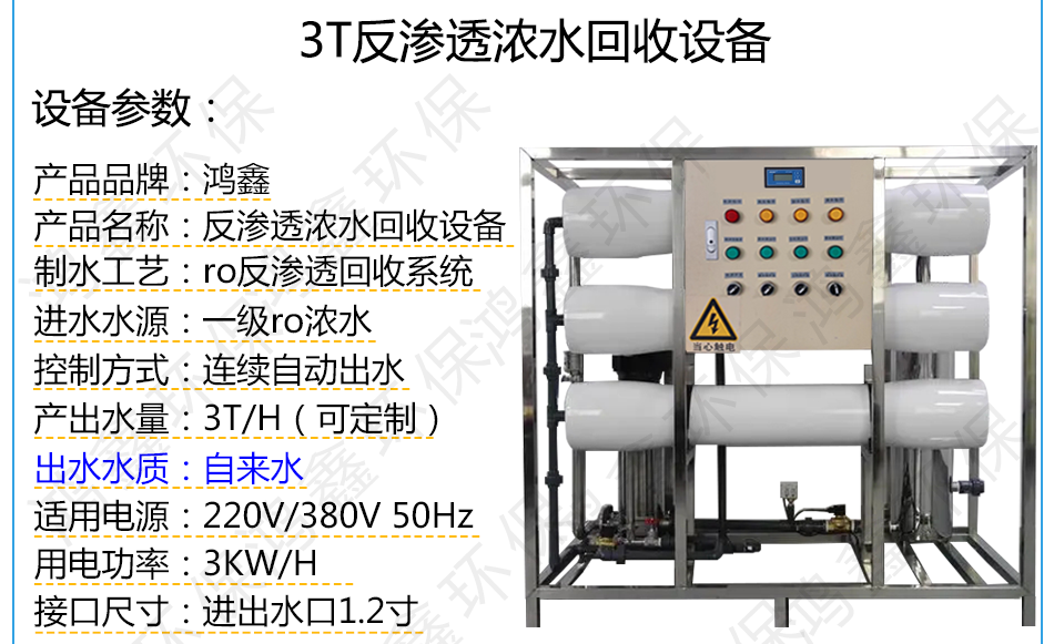 反渗透浓水回收设备就是一台专门处理ro反渗透纯水设备的一级浓水,将RO一级浓水处理后变成自来水返给反渗透设备当自来水用,回收率在60%~70%之间。像这个3T/H的浓水回用设备每小时可处理浓水5.5吨,也就是1吨浓水处理后有0.6T~0.7T变成自来水回到纯水设备的自来水箱中当自来水再用。