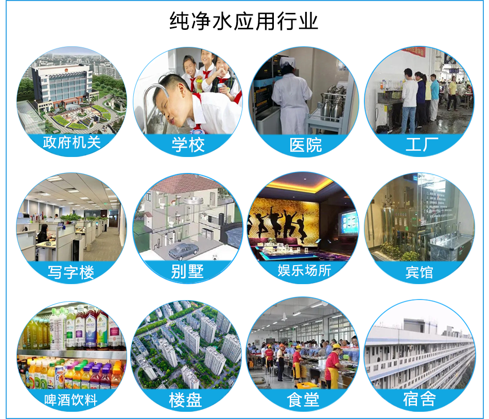 目前反渗透纯净水设备现已进入家庭,公司,商场,银行,办公室,写字楼,招待所,会议室和宾馆客房,酒吧,卡拉OK厅,医院,车站,宿舍,工厂,等各种场所使用,可以说是家喻户晓了