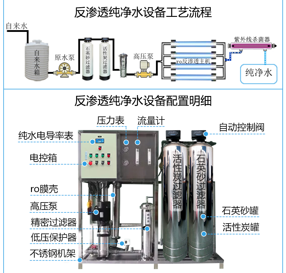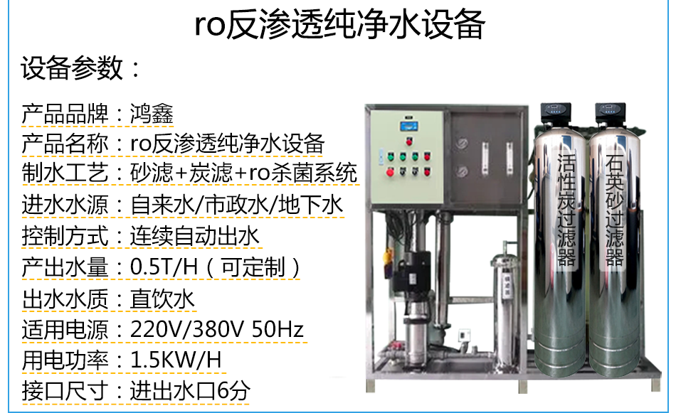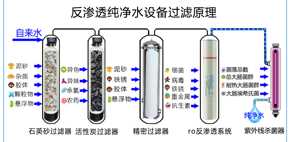 反渗透纯净水设备也是直饮水设备,由原水箱+原水泵+石英砂过滤器+活性炭过滤器+RO反渗透主机过滤系统+紫外线杀菌器+纯水箱这些装置组成,其实也是纯水设备+紫外线杀菌消毒后达到可以直饮的效果。