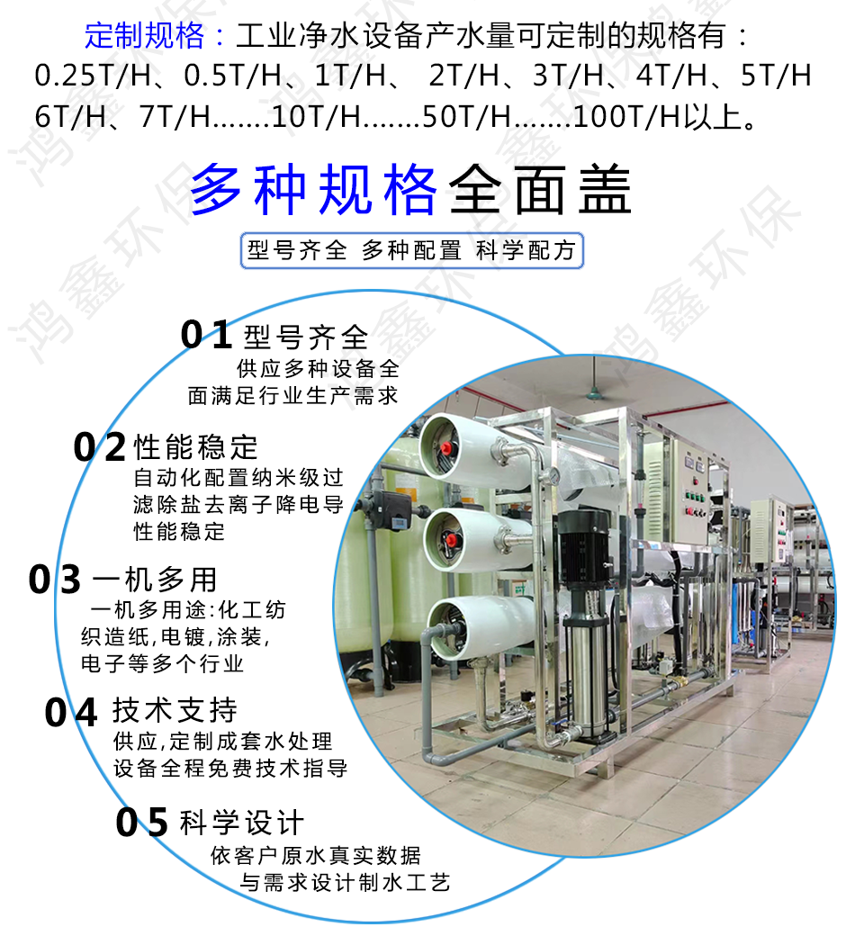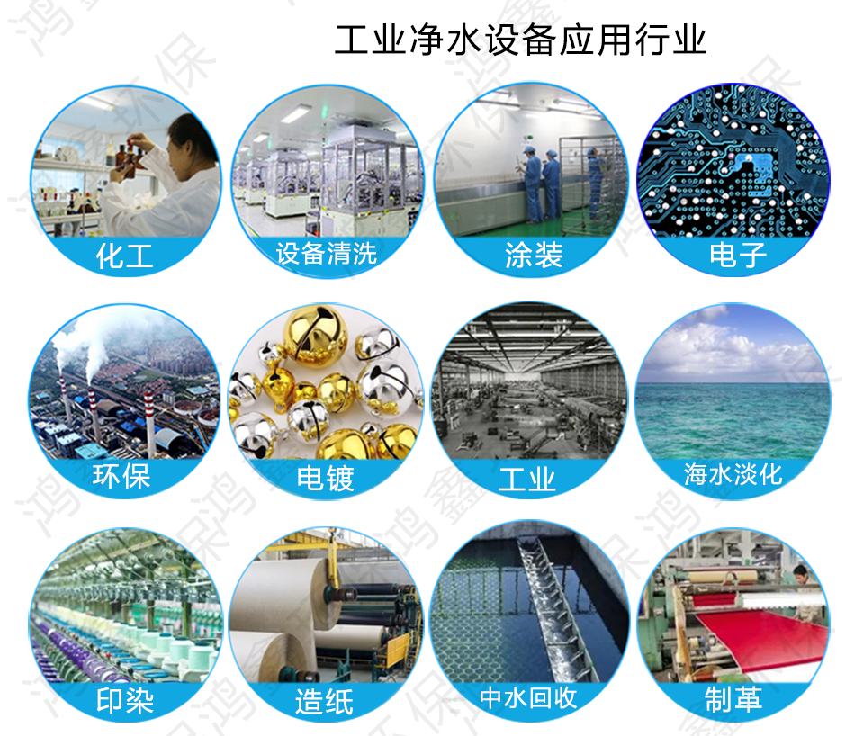 鸿鑫环保设备15年专注于水处理净化工艺的设计、生产销售安装、设备维护、设备出租、技术服务为一体的一条龙服务企业,所有的设备可依据客户需求来定制,定制的设备类型有:市政生活用水处理设备、直饮纯净水设备、超滤处理设备、ro反渗透纯水设备,离子交换纯水设备、EDI超纯水设备、软化水处理设备、RO浓水回收设备、中水回用设备。