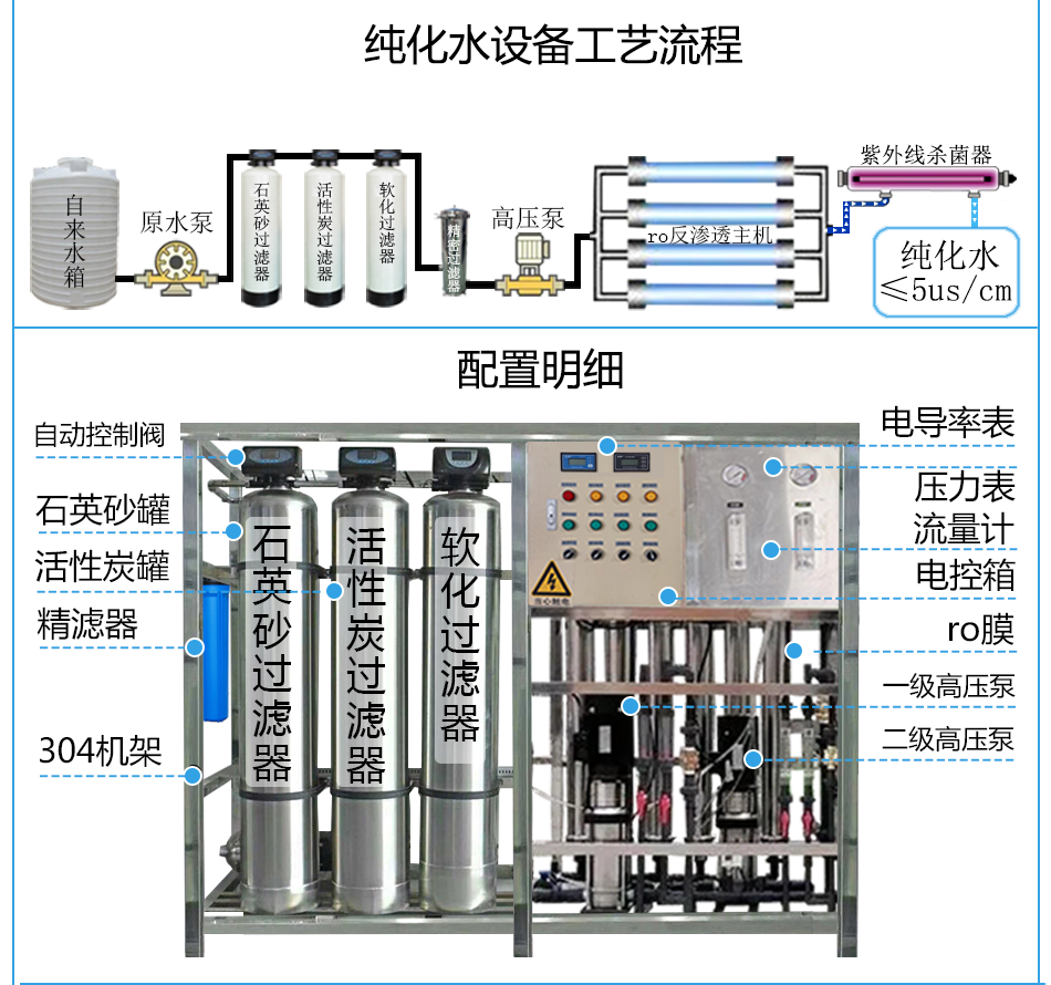 原水箱+原水泵+石英砂过滤器+活性炭过滤器+保安过滤器+ro反渗透系统+紫外线杀菌器+无菌水箱。