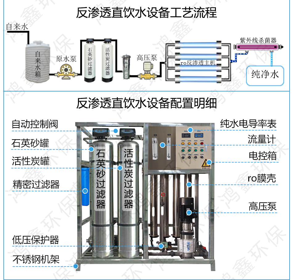 原水箱→原水泵→石英砂过滤器→活性炭过滤器→精密过滤器→高压泵→RO反渗透系统→紫外线杀菌→纯净水箱→用水点