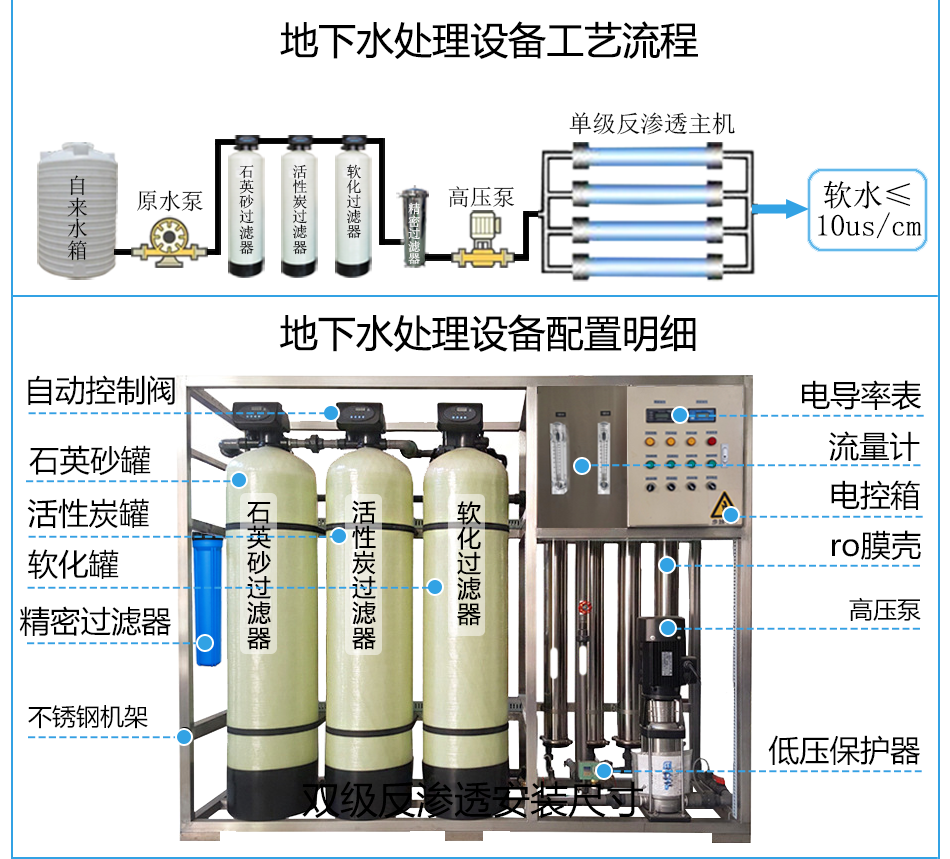 地下水水箱增→压泵→石英砂过滤器→活性炭过滤器→软化过滤器→中间水箱→超滤系统→用水点。