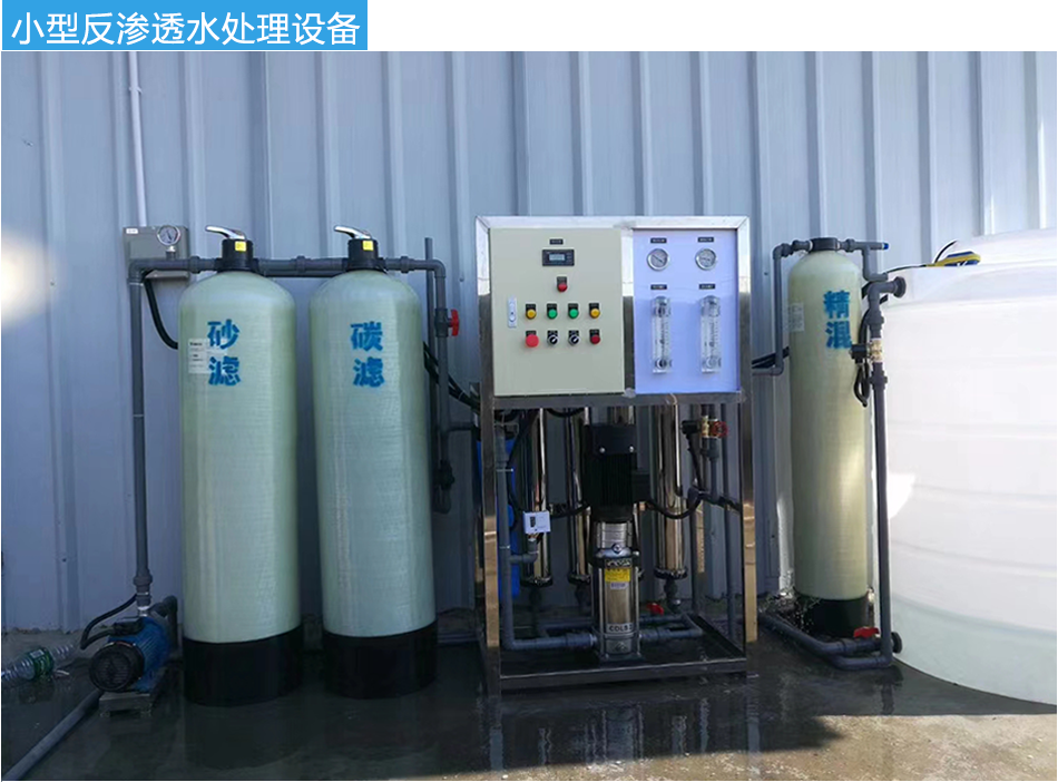 小型反渗透水处理设备工作时是由高压泵对进水进行加压进入ro反渗系统,在泵压的作用下水分子不断地透过膜,经过产水流道流入中心管,然后在一端流出水中的杂质,如离子、有机物、细菌、病毒等,被截留在膜的进水侧,然后在浓水出水端流出,是将原水经过精细过滤器、颗粒活性碳过滤器、压缩活性碳过滤器等,再通过泵加压,利用孔径为1/10000μm(相当于大肠杆菌大小的1/6000,病毒的1/300)的反渗透膜(RO膜),使较高浓度的水变为低浓度水,同时将工业污染物、重金属、细菌、病毒等大量混入水中的杂质全部隔离,从而达到分离净化目的。
