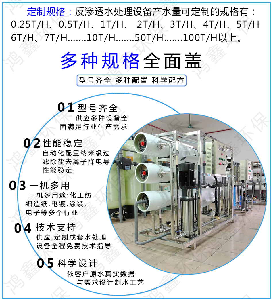 鸿鑫环保设备15年专注于水处理净化工艺的设计、生产销售安装、设备维护、设备出租、技术服务为一体的一站式纯水设备生产厂家,所有的设备可依据客户需求来定制,定制的设备类型有:市政生活用水处理设备、直饮纯净水设备、超滤处理设备、ro反渗透纯水设备,离子交换纯水设备、EDI超纯水设备、软化水处理设备、RO浓水回收设备、中水回用设备。