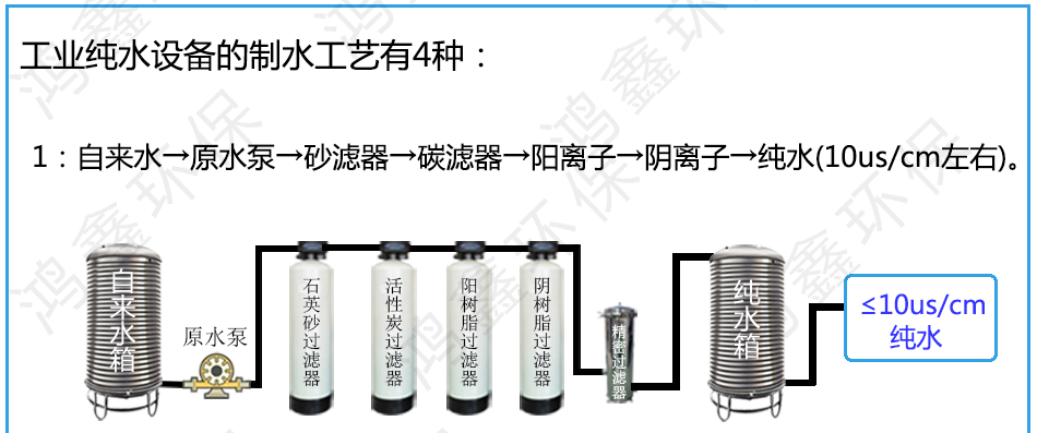 1:自来水→原水泵→砂滤器→碳滤器→阳离子→阴离子→纯水(10us/cm左右)。