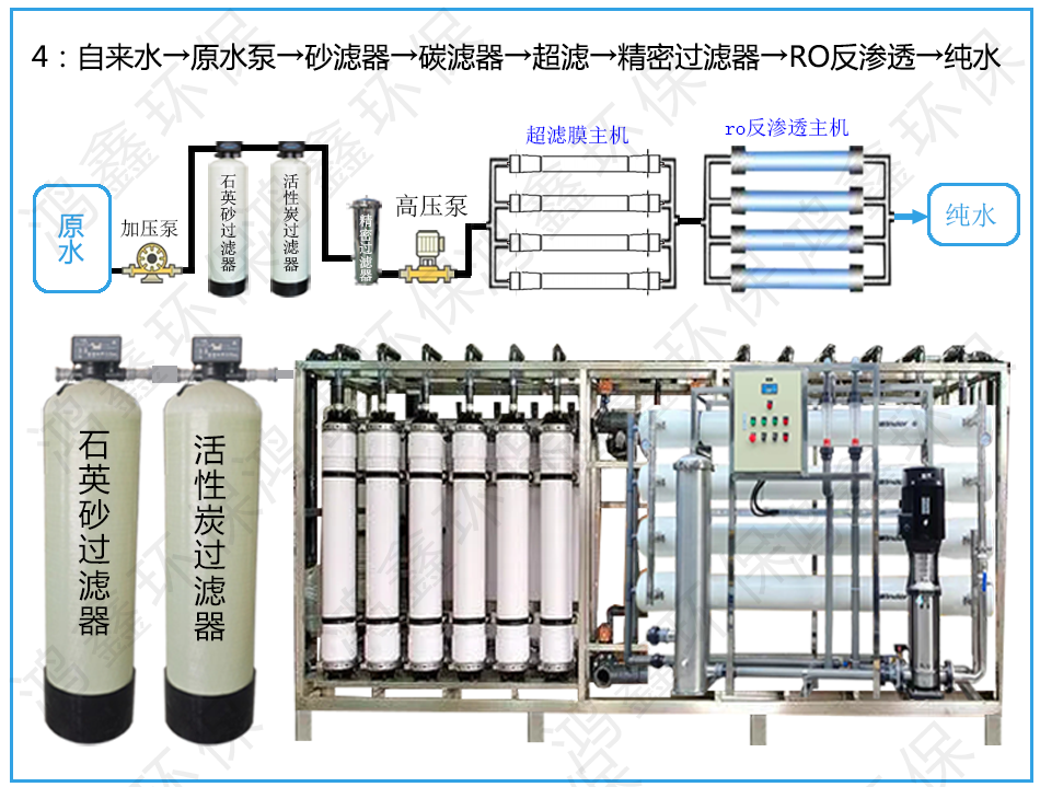 4:自来水→原水泵→砂滤器→碳滤器→超滤→精密过滤器→RO反渗透→纯水。