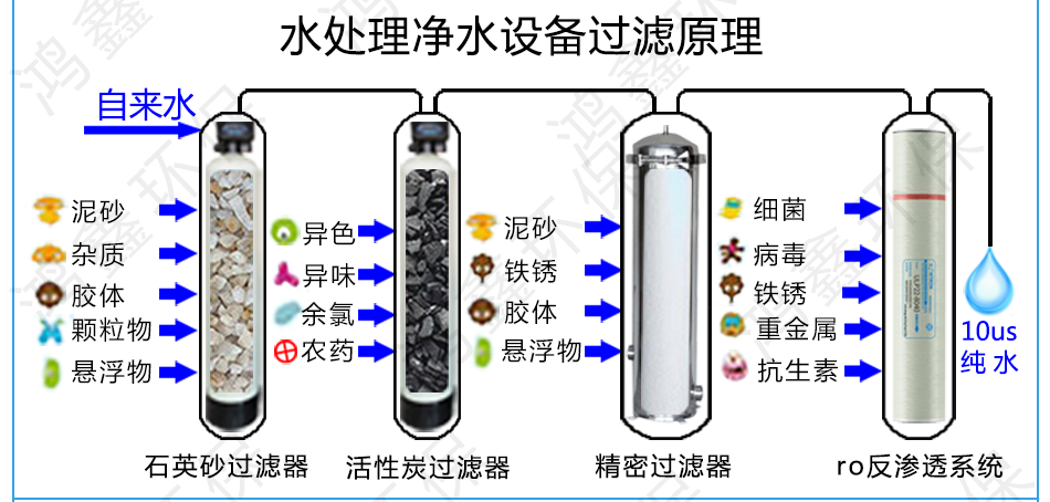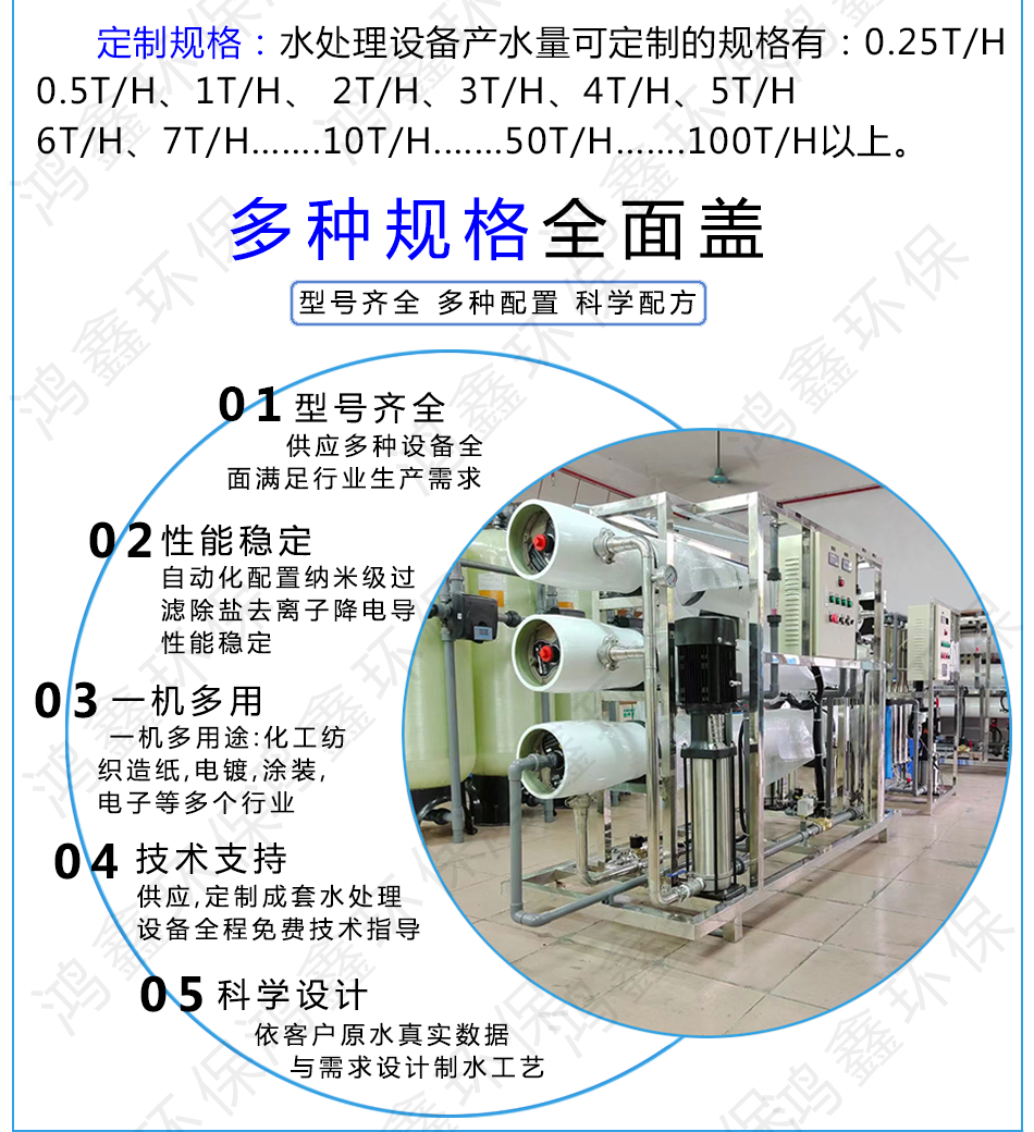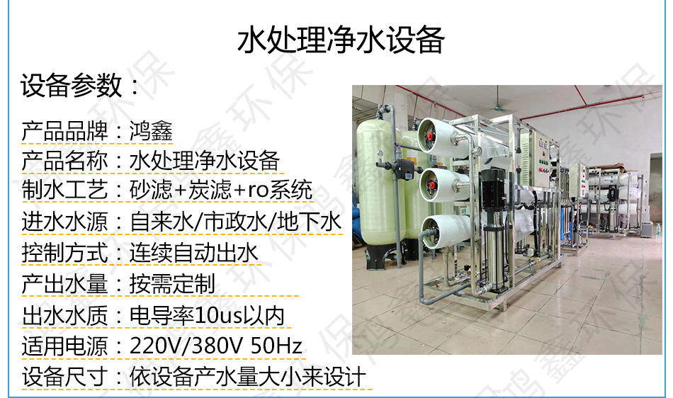 鸿鑫环保设备15年专注于水处理净化工艺的设计、生产销售安装、设备维护、设备出租、技术服务为一体的一条龙服务企业,所有的设备可依据客户需求来定制,定制的设备类型有:市政生活用水处理设备、直饮纯净水设备、超滤处理设备、ro反渗透纯水设备,离子交换纯水设备、EDI超纯水设备、软化水处理设备、RO浓水回收设备、中水回用设备。