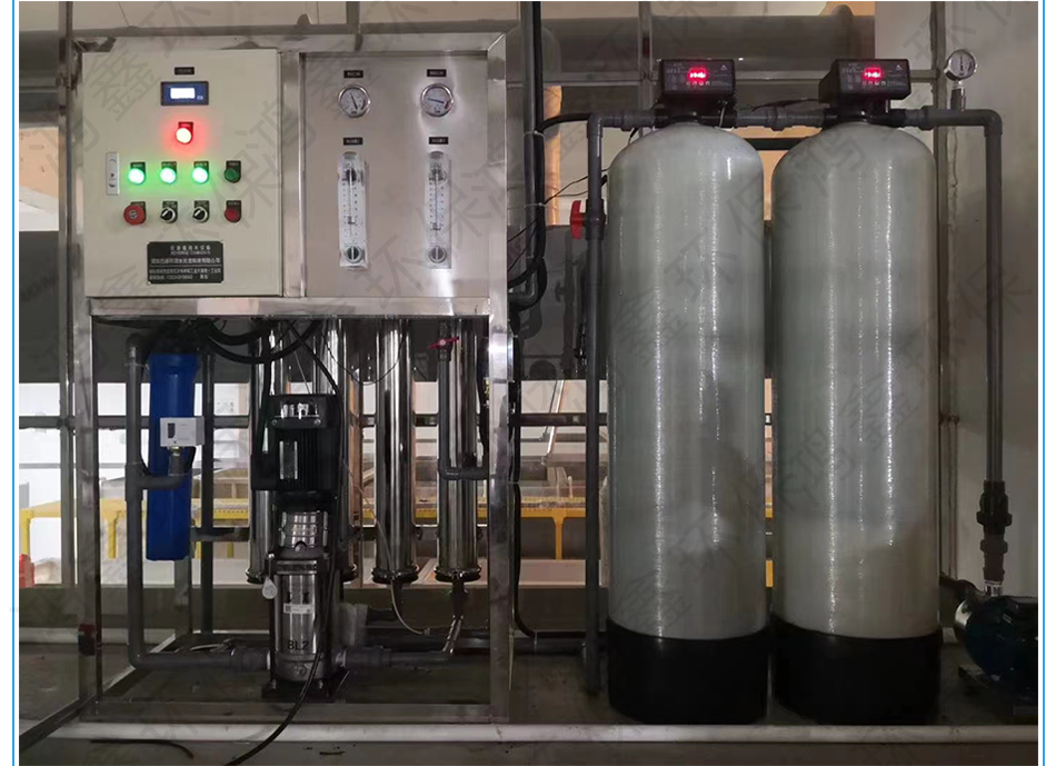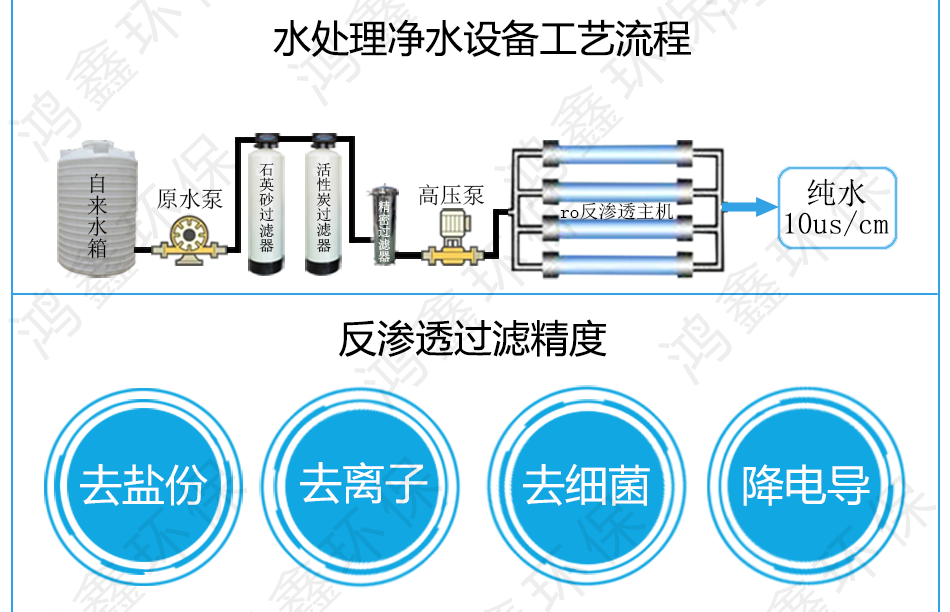 水处理净水设备制水工艺是由原水箱→原水泵→石英砂过滤器→活性炭过滤器→RO反渗透系统→纯水箱这些组成,也就是水只经过RO过滤系统过滤一次,除盐率一般为98-99%,出水的电导率在5us/cm-10us/cm之间。
