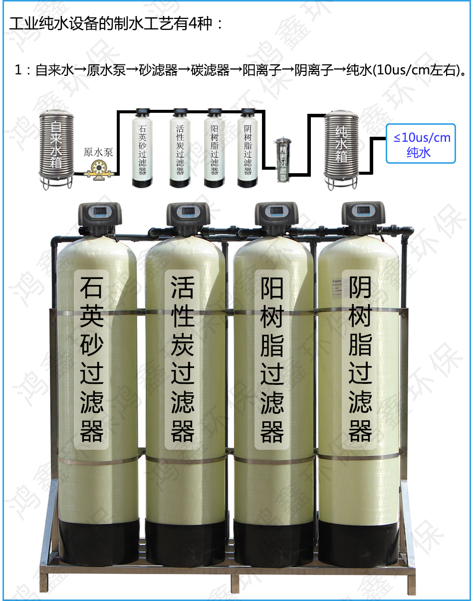 1:自来水→原水泵→砂滤器→碳滤器→阳离子→阴离子→纯水(10us/cm左右)。